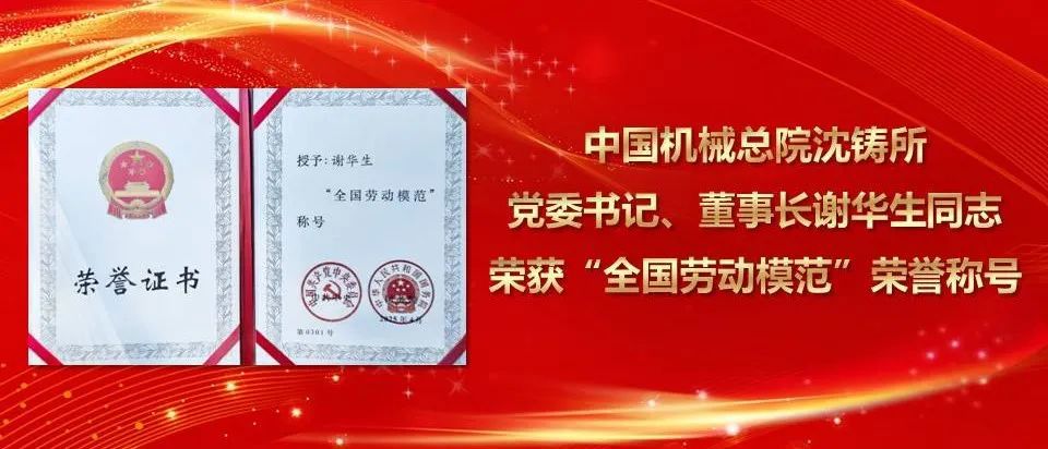 4月28日,全國(guó)勞動(dòng)模范和先進(jìn)工作者表彰大會(huì)在北京人民大會(huì)堂召開,中國(guó)機(jī)械總院集團(tuán)沈陽鑄造研究所有限公司黨委書記、董事長(zhǎng)謝華生榮獲“全國(guó)勞動(dòng)模范”榮譽(yù)稱號(hào)。